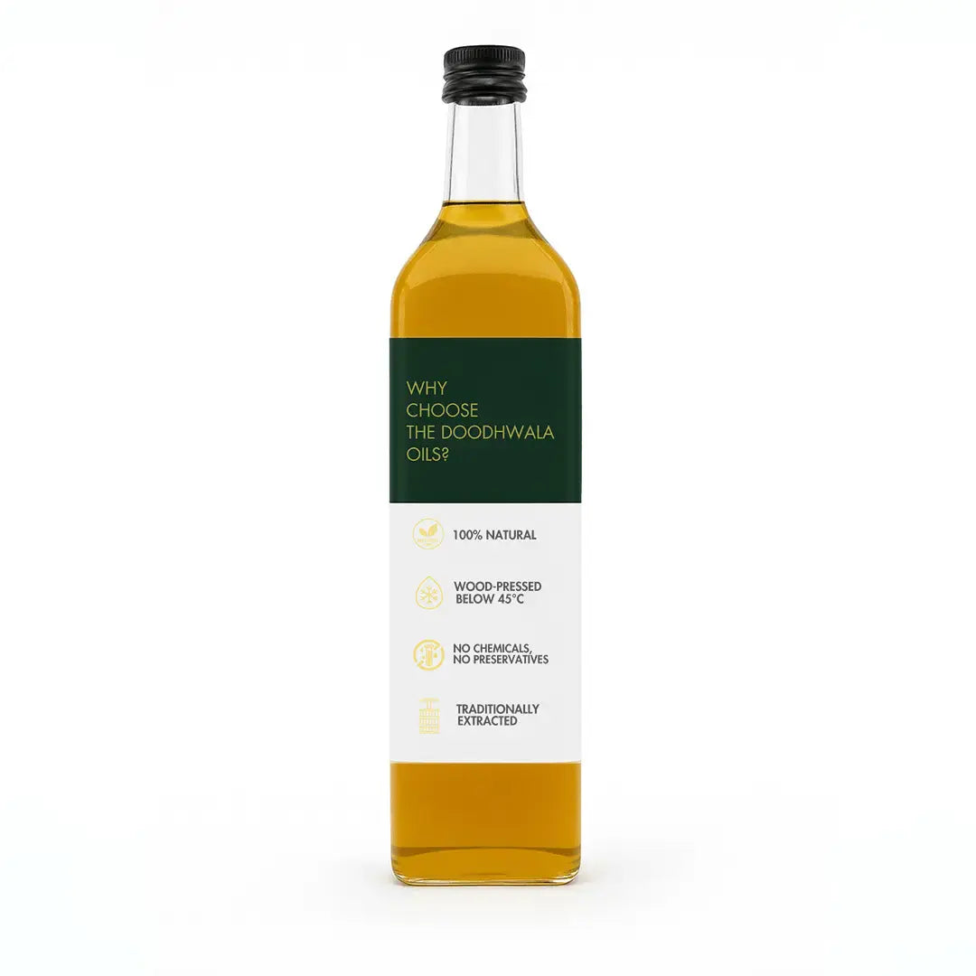 Wood pressed oil is extracted using a traditional wooden press (ghani) at a low temperature. This method retains the natural nutrients, aroma, and flavor of the oil, unlike refined oils which go through heat and chemical processing.